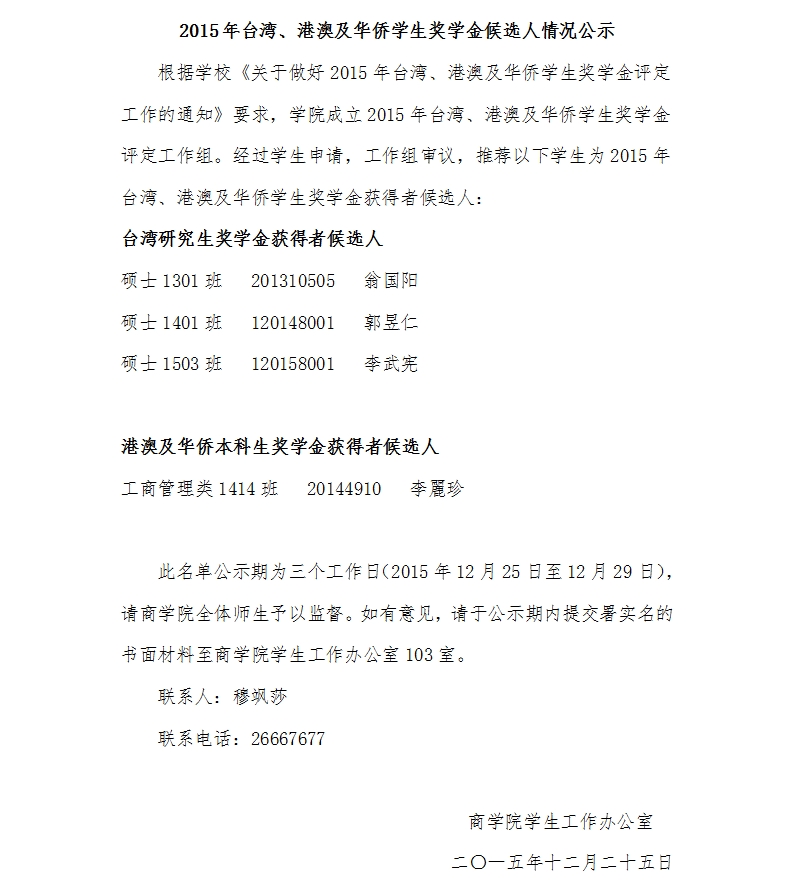 2015年台湾、港澳及华侨学生奖学金候选人情况公示