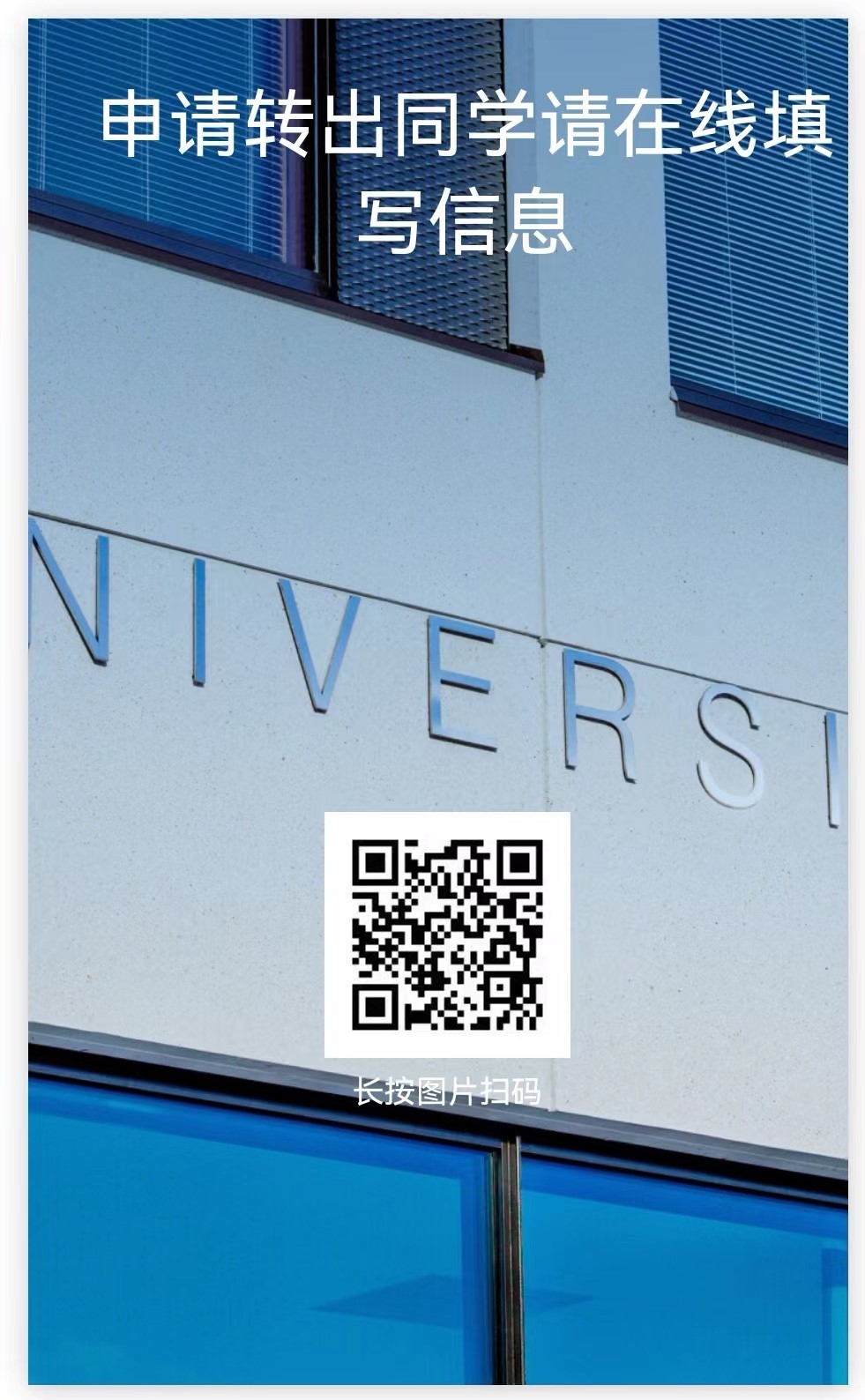 学生跨类及跨专业转专业申请表》本人签字后,拍照或扫描成电子版发送至指定邮箱,并微信扫码填写相关信息(见下图),学院将统一为申请转出学生打印成绩单并按照相关规定审核转出资格,在符合转出资格的学生申请表上签字盖章,并由学院在5月9日前统一将审核通过的学生成绩单、申请表及汇总表转给相关学院,后续测试、录取流程需学生本人关注拟转入学院通知。