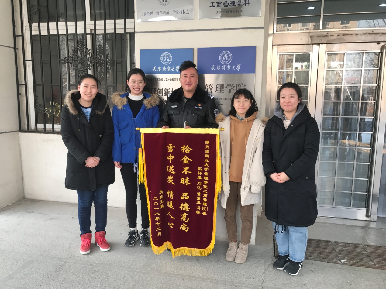 工商管理类1801 班赵轩逸、刘忆、董金玉、冯源四名同学,在校外乘坐出租车时捡到一个皮包,内有证件、银行卡等贵重物品及近1万元现金。返校后,她们立即报警,将拾到的物品原样交给佳荣里派出所。当晚11点多,警方联系到失主,并将物品奉还。