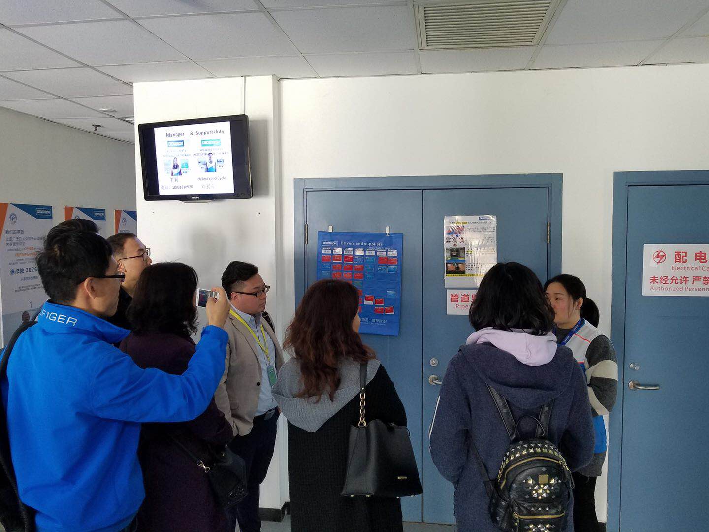 在迪卡侬仓储部经理范一彬的陪同下,参观了燕郊物流园一期仓库,了解迪卡侬物流的业务流程、仓库的规划设计、物流设施建设及物流管理评价等,并交流了建设虚拟仿真物流仓库的具体问题。