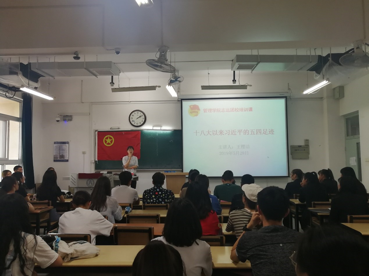 结课仪式在慷慨激昂的中国共产主义青年团团歌中开始。王樱洁讲授了《十八大以来习近平的五四足迹》主题团课,分享了习近平总书记在2013年至2019年五四期间提出的对广大青年的寄语,特别讲述了习近平总书记关于青年学生成长成才方面的重要论断。从2014年习近平总书记提出的“勤学、修德、明辨、笃实”,到2018年提出的“爱国、励志、求真、力行”,再到2019年习近平总书记在纪念五四运动100周年大会上提出的新时代中国青年六点要求,王樱洁结合团员青年学习思想、品德养成、学生工作、大学生活实际进行了深入浅出的讲解,同时提出团支部应通过形式新颖的团日活动将高深的理论知识让广大青年学生在具体实践中潜移默化的接受,并强调团干部应在“思想引领”和“成长服务”两方面发挥带头作用。主题团课结束后,王樱洁、桑振龙为志远团校的17、18级优秀学员颁发了证书,优秀学员代表分享了上团课的收获,全体参会的团员青年在现场写下了自己的团课感悟。