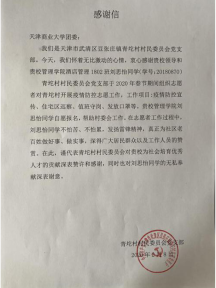酒店管理专业1802班刘思怡同学主动向所在的天津市武清区青坨村村委会报名,参加村疫情防控志愿服务工作。2月6日至8日,她连续三天在该村疫情防控检查点值班守岗,负责进出该村车辆及人员的登记和向该村村民发放口罩等防护用品工作。在志愿服务工作中,刘思怡同学不怕苦、不怕累,积极工作,受到了该村村民和工作人员的表扬,以实际行动书写了当代大学生的担当和使命。为此,青坨村村民委员会党支部特向学院发来感谢信,对刘思怡同学的辛勤付出和Jinx漫画