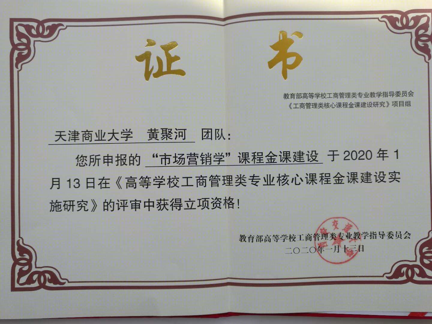 黄聚河教授负责的《市场营销学》团队,经四十多位专家的函评和会评,获得《教育部工商管理类核心课程金课建设》立项资格。
