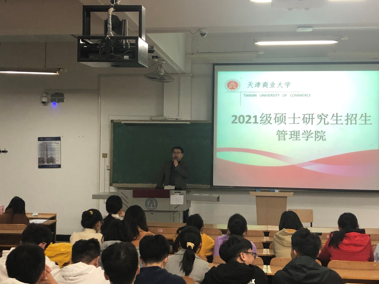 在3教202举行2021年考研就业推动会。学院党委副书记沈洁、副院长李耘涛、研究生辅导员郭瑞、优秀毕业研究生代表狄佩佩、研究生代表查欣彤及150余名本科生参加。会议由辅导员李秀峰主持。