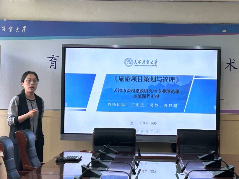 研究生教学一线的部分任课教师参加了本次活动。本次研究生教学观摩课程为《旅游项目策划与管理》,该课程是天津市课程思政研究生专业理论示范课程,主讲教师为《旅游项目策划与管理》课程团队成员、旅游管理系吴静老师。吴静老师从课程建设基本情况、课程目标达成情况、教学手段运用情况、课程与思政教育结合、教学特色与教师团队五方面对该课程进行了汇报讲解。