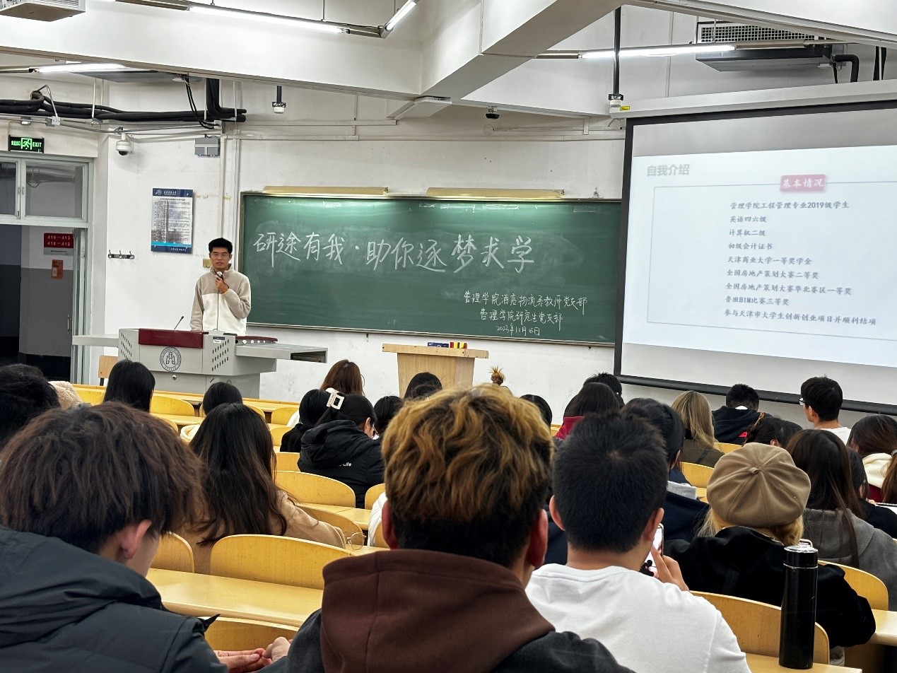 酒店管理系教师邢博以“明确规划的重要性”为导向,“脚踏实地的必要性”为准则,向各位同学传递了“路不能盲目走,研必须坚定考”的理念。物流管理系教师李辉用幽默风趣的语言引导学生从实际出发,明确未来发展方向,并分享科学备考方法。