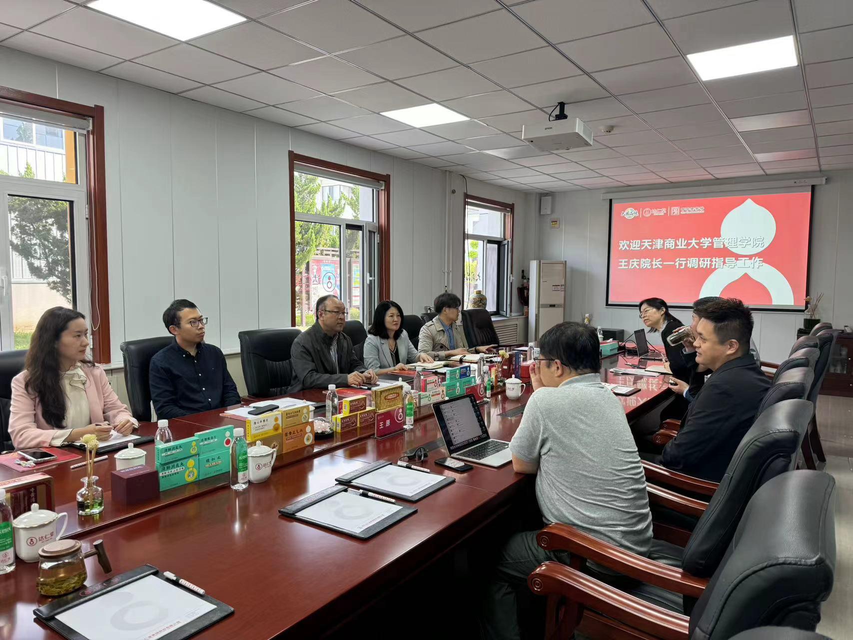院长王庆、副院长王艳芝以及国际教育合作学院刘玉莹老师等一行五人前往津药达仁堂京万红(天津)药业有限公司(以下简称“京万红”),就中华“老字号”品牌发展理念、企业发展路径、校企融合创新发展等进行了深度座谈交流。京万红公司执行董事张祥麒、副总经理周升,津药达仁堂集团股份有限公司(以下简称“达仁堂集团”)战略管理部部长王原,京万红办公室相关工作人员参与了座谈。京万红副总经理周升主持会议。