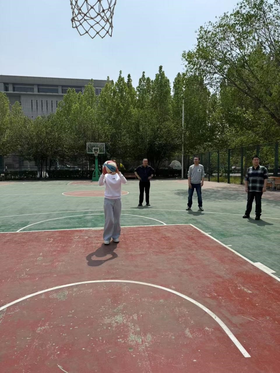 篮球场上,投篮比赛紧张而热烈。参赛教师们手持篮球,眼神专注,瞄准篮筐奋力投掷。有的教师凭借娴熟技巧,接连命中三分,赢得阵阵喝彩;有的虽初次尝试,但在同事的加油声中渐入佳境,不断调整姿势、总结经验。随着一颗颗篮球在空中划出优美弧线,现场欢呼声、掌声此起彼伏,气氛愈发高涨。
